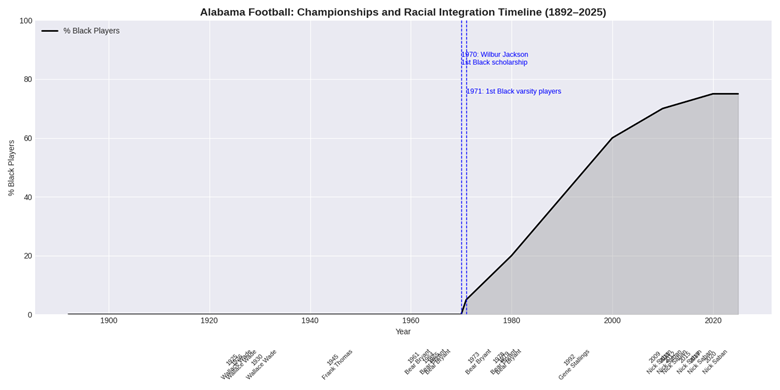 • 2000s–Present: Nick Saban’s dynasty built on rosters ~60–75% Black, producing Heisman winners Mark Ingram, Derrick Henry, DeVonta Smith, and Bryce Young.